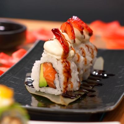 Interno: salmone e avocado; esterno: philadelphia, fragola e teriyaki. Allergeni:...